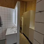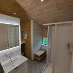La villa 1305-Aakirkeby-Strandparken-10 comprend une salle de bains avec une douche et une machine à laver. Un sèche-cheveux sont également à votre disposition.